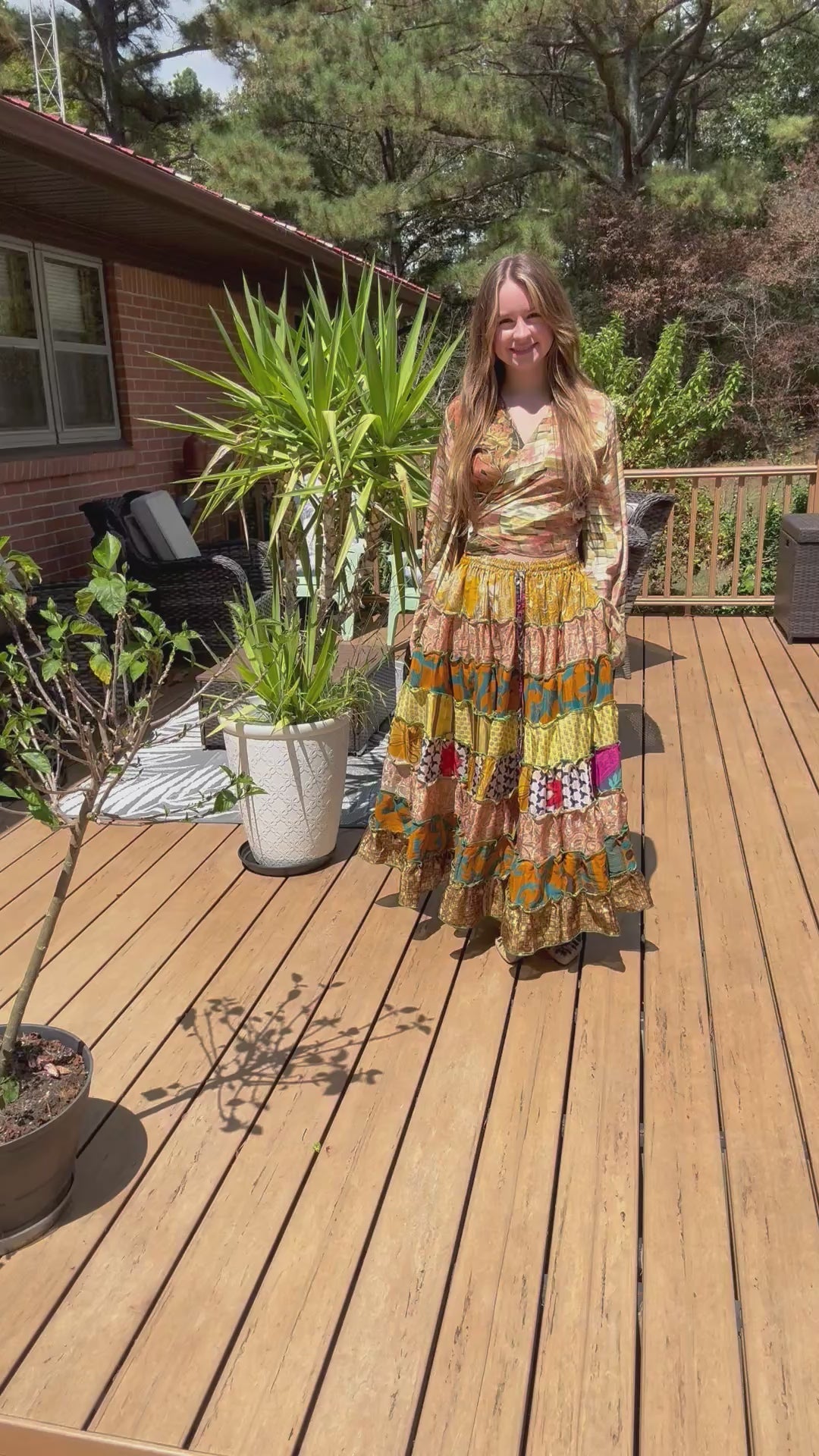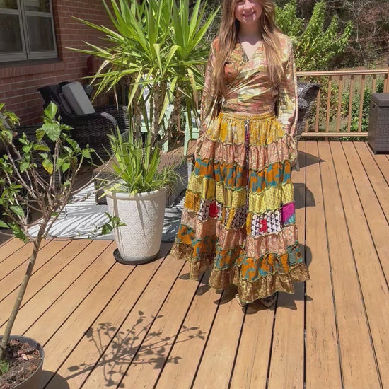 " Be Free Skirt Set " is a beautiful patchwork flare maxi skirt with Bell Sleeves Wrap Top that compliments it so well . .