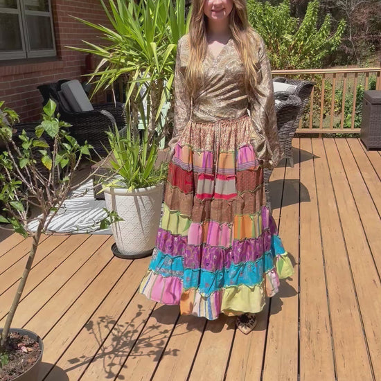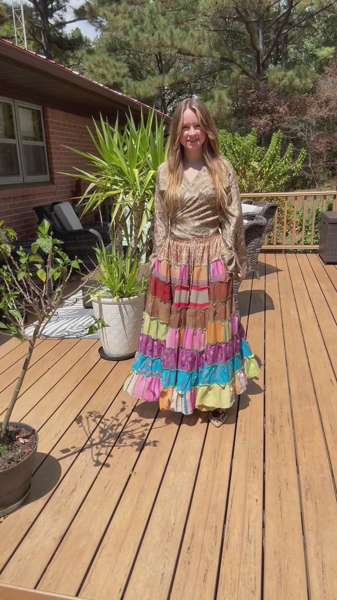 " Be Free Skirt Set " is a beautiful patchwork flare maxi skirt with Bell Sleeves Wrap Top that compliments it so well . .
