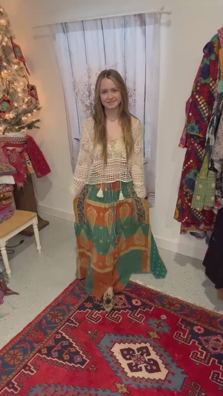 "Peasant Skirt" is a beautiful skirt in light kantha with oversized pockets and side cinch . One size fits most from S to 2x maybe 3X - please refer to the measurements