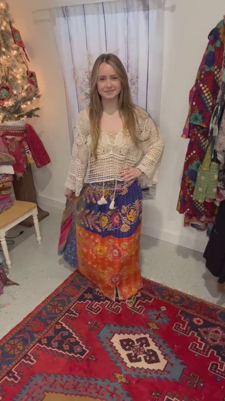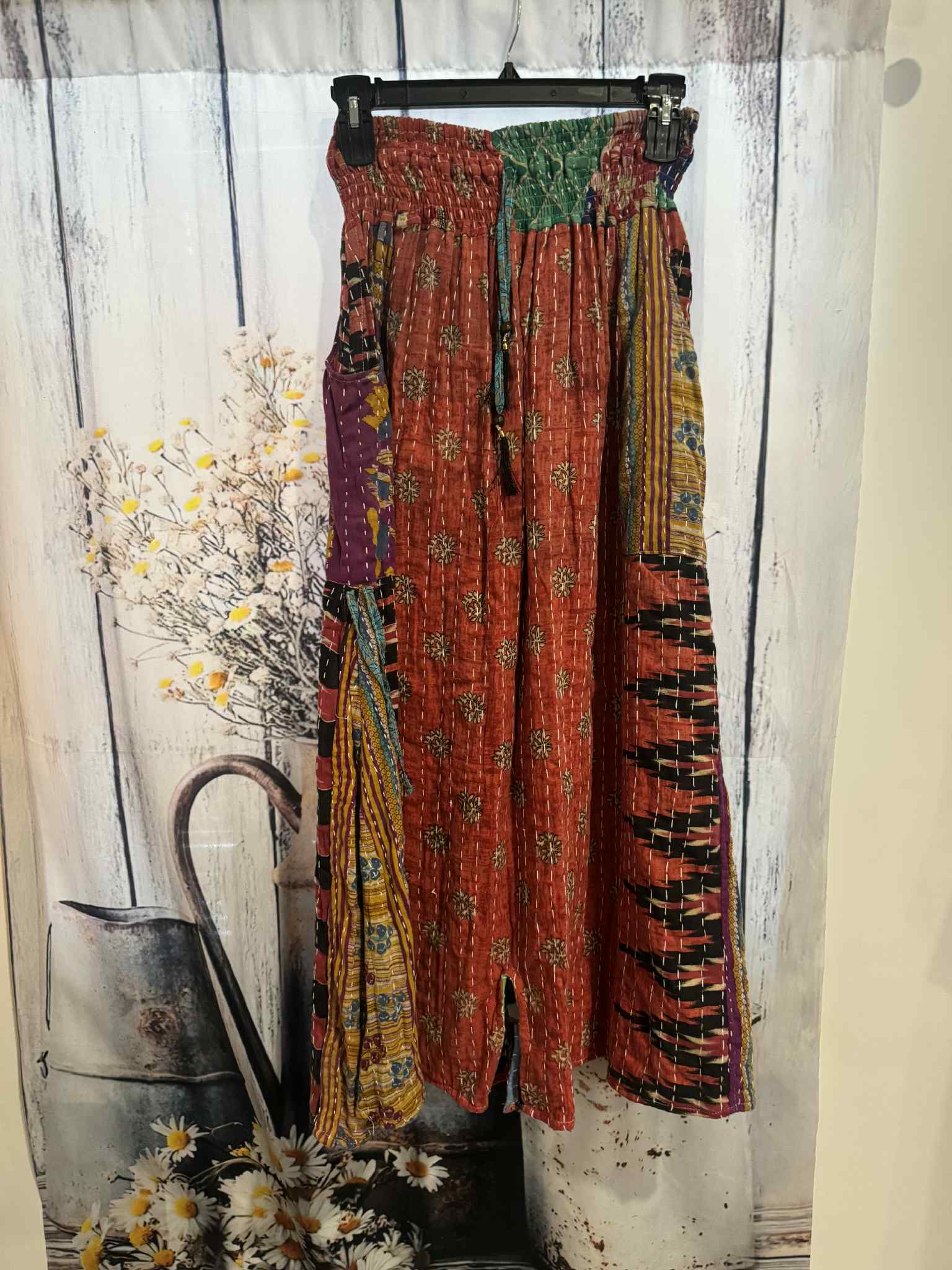 "Peasant Skirt" is a beautiful skirt in light kantha with oversized pockets and side cinch . One size fits most from S to 2x maybe 3X - please refer to the measurements