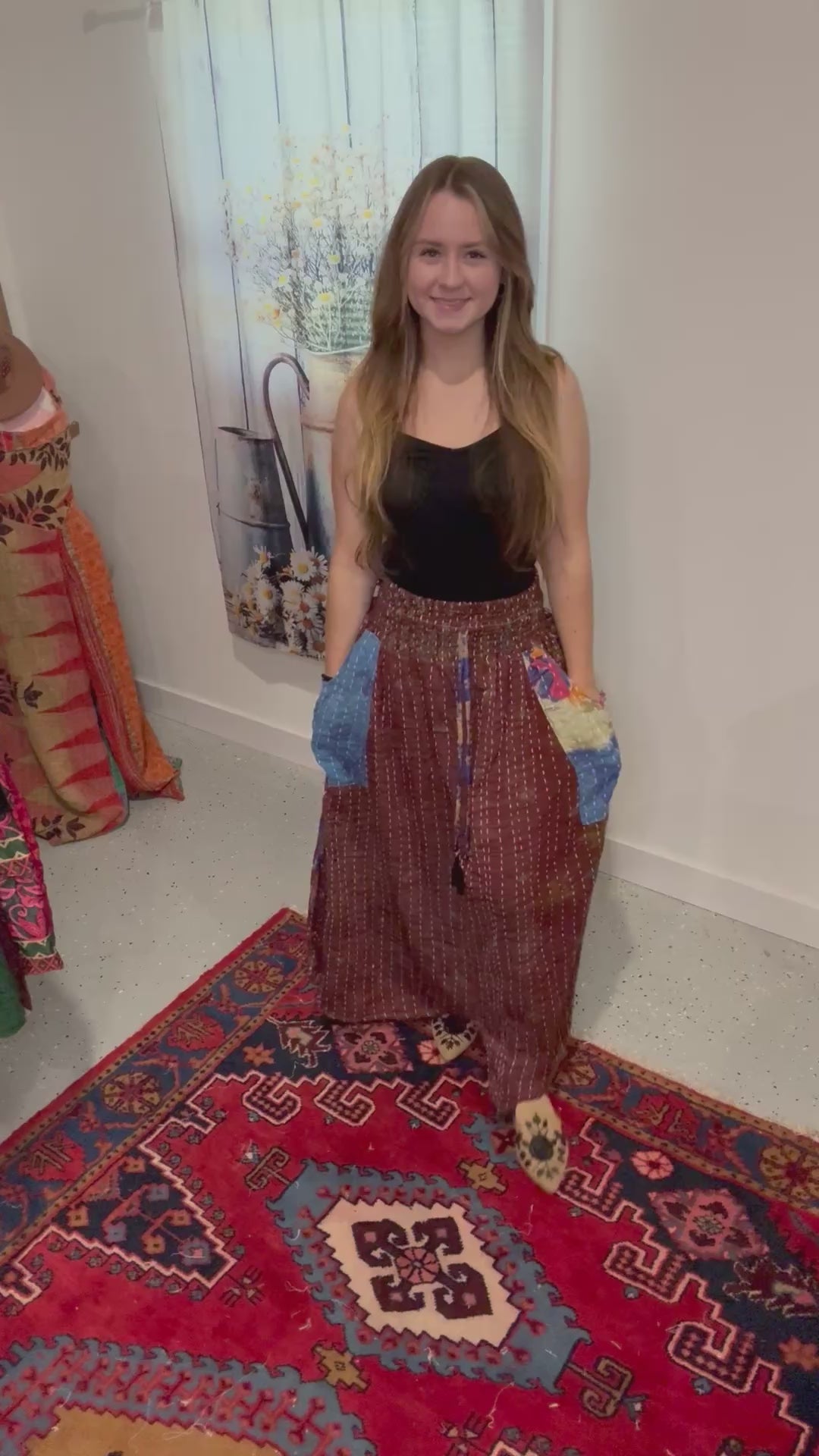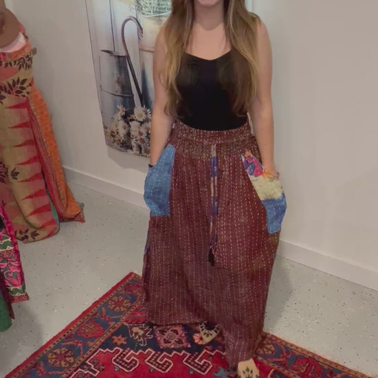 "Peasant Skirt" is a beautiful skirt in light kantha with oversized pockets and side cinch . One size fits most from S to 2x maybe 3X - please refer to the measurements