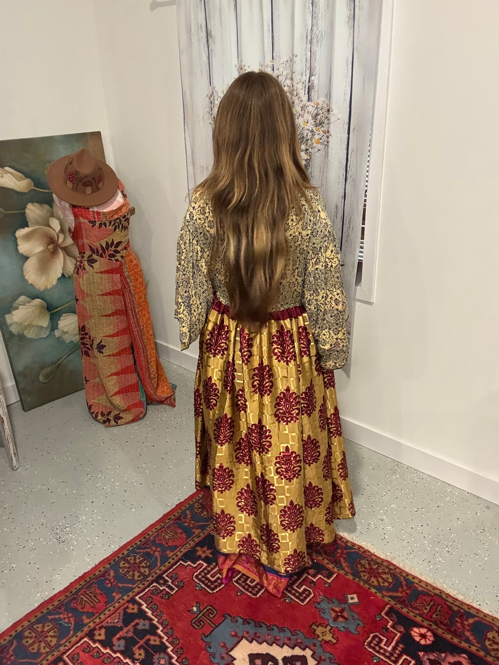 "Moon Light Bloom" Empire Waist Maxi Dress Kantha / Polysilk - One Size S to 2X