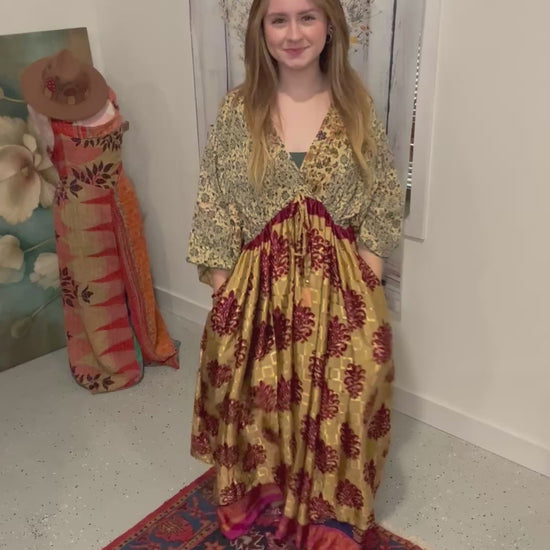 Moonlight Bloom is a beautiful empire waist maxi dress , one of a kind . Has a plunged neck line in the front with a tie around the bust for a flattering fit . Beautiful layers of vintage silk from undebust down -