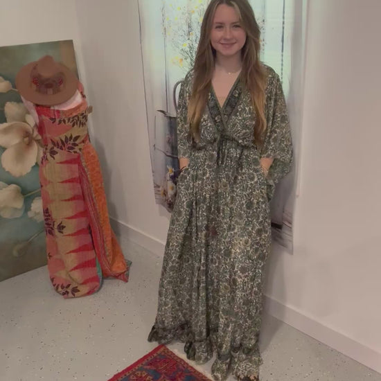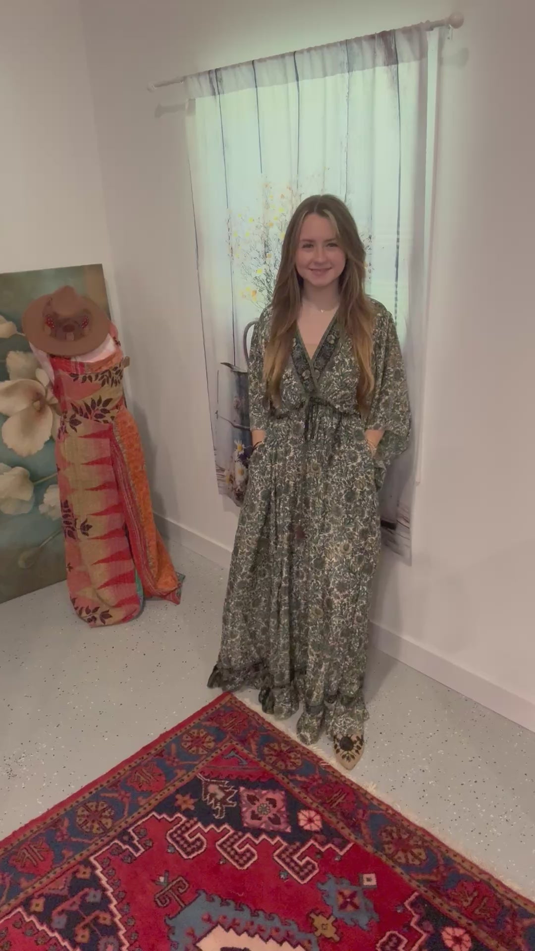 Moonlight Bloom is a beautiful empire waist maxi dress , one of a kind . Has a plunged neck line in the front with a tie around the bust for a flattering fit . Ruffled at the bottom .