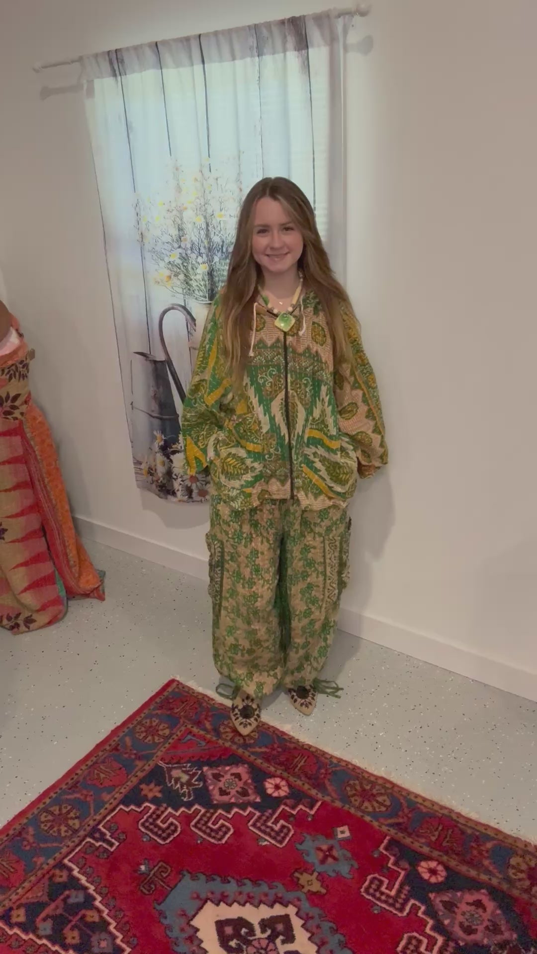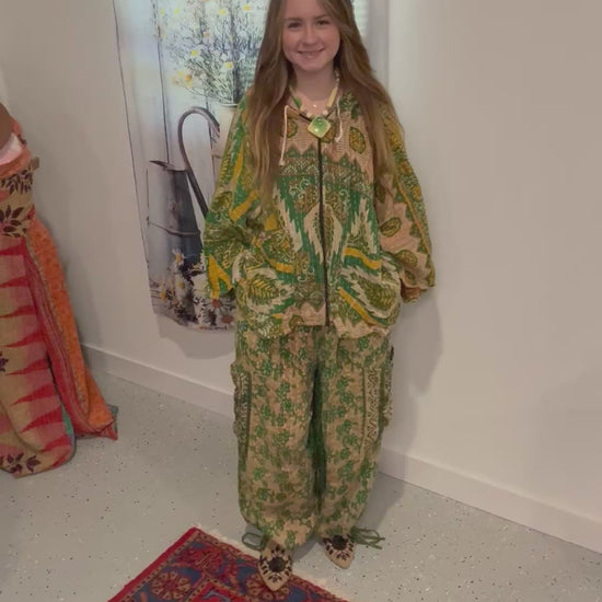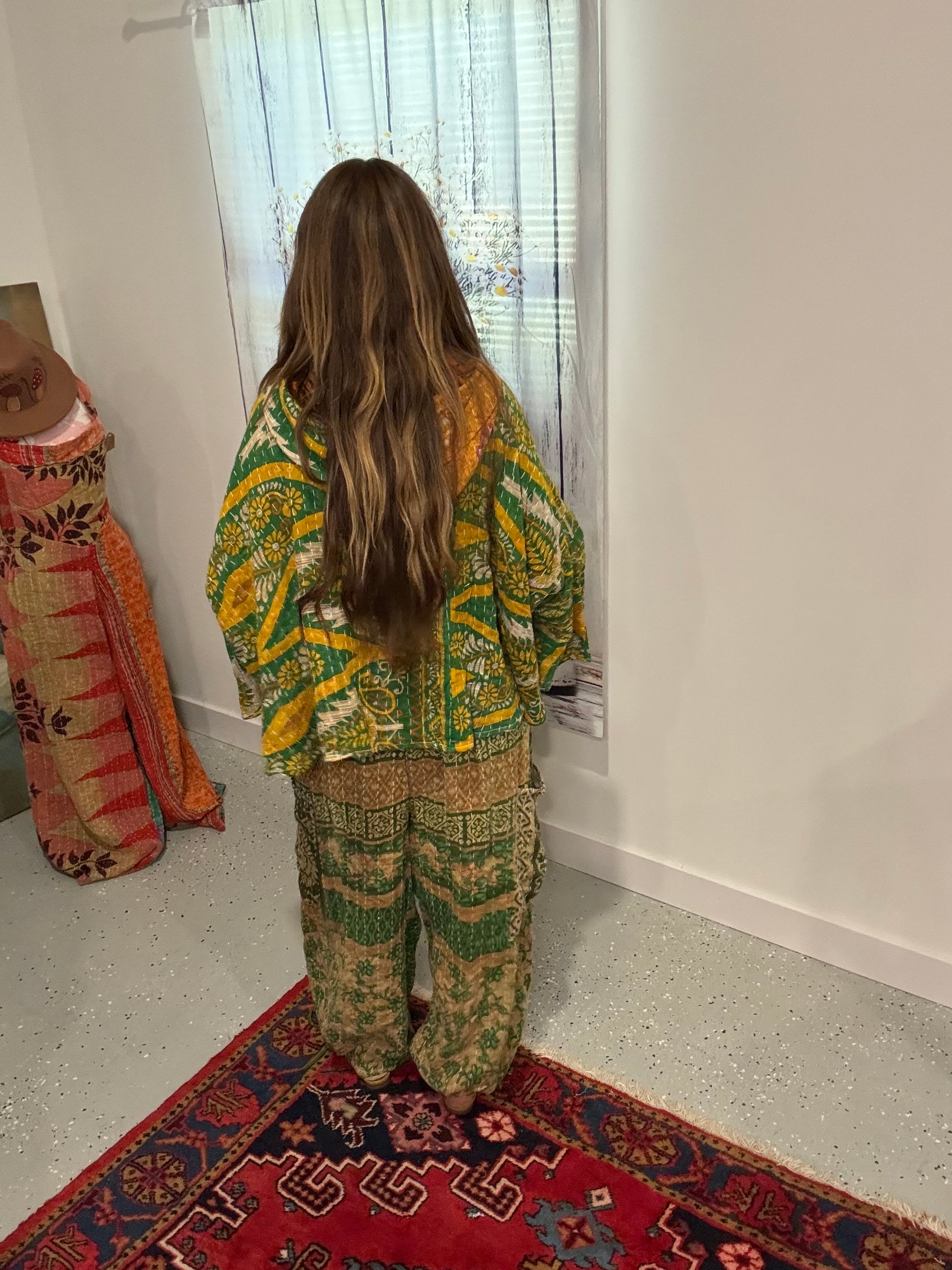 Beautiful Kantha Set - consists of reversable poncho with hoodie and convertable pants - One Size fits S to 3X - pls refer to the measurements