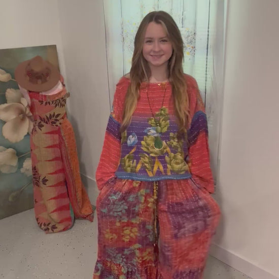 Set of Top and Ruffle pants in 2 layers kantha - One Size S to 3X
