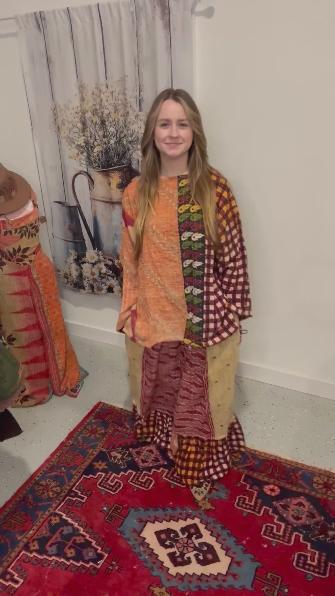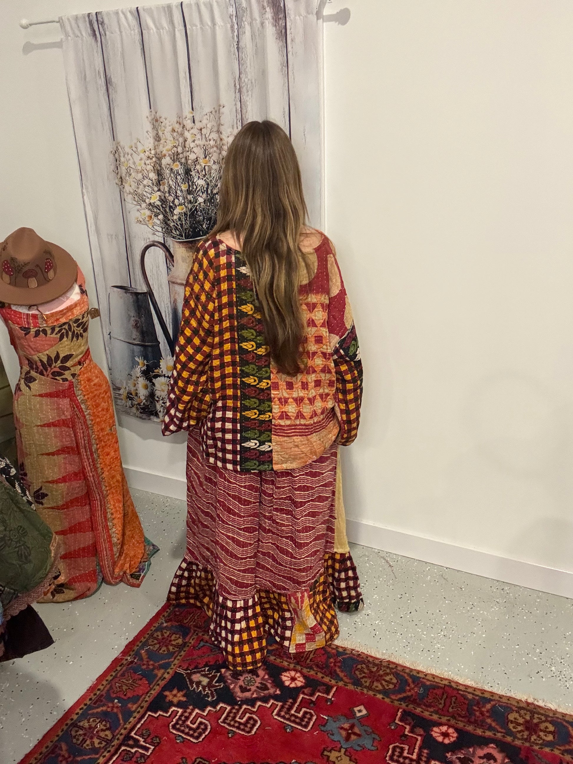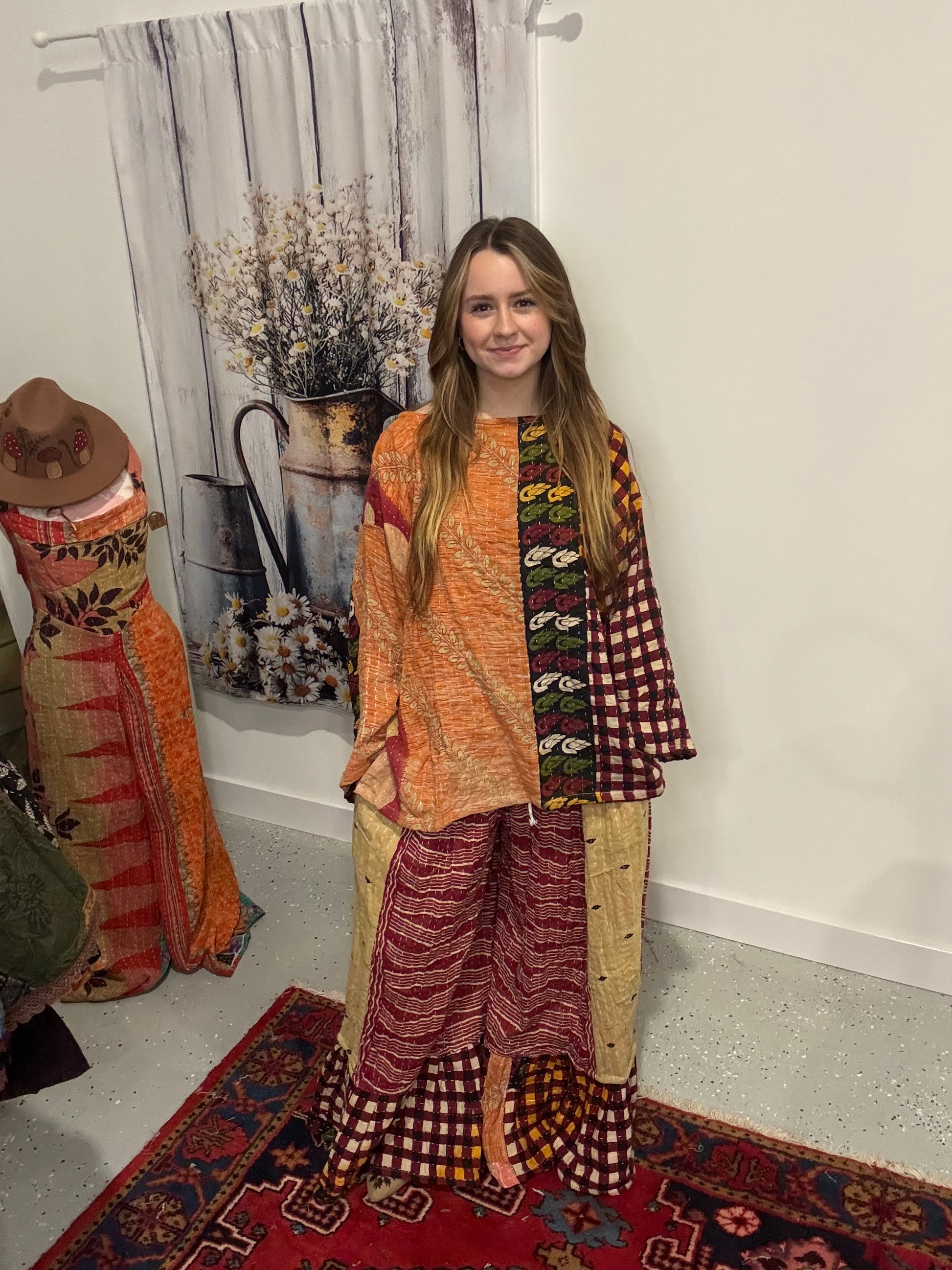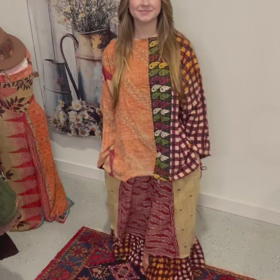 Beautiful set of tunic and rufle pants in 3 layers kantha - One size M to 3X - please refer to the measurements .