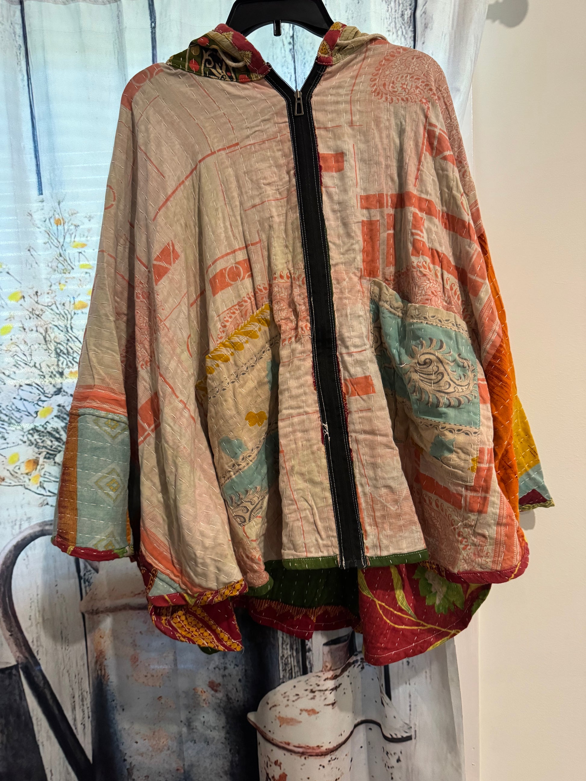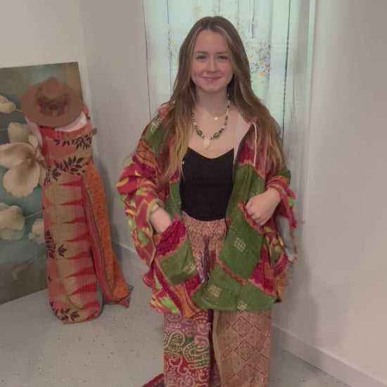 Set of reversable poncho and ruffle palazzo pants in 3 layers kantha - One size S to 3X